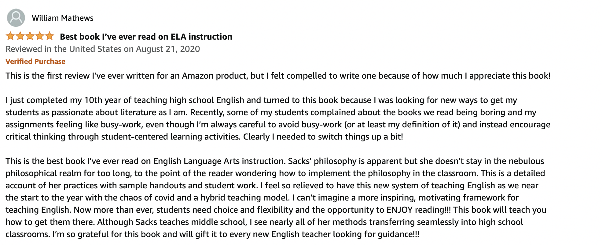 "Ariel Sacks has been sharing for years on her blog unique ideas for engaging students in higher-order thinking and learning. I'm excited that now we all get to benefit from reading a full-length book where she has the opportunity to fully lay out her approach to English instruction and offer practical lessons!"